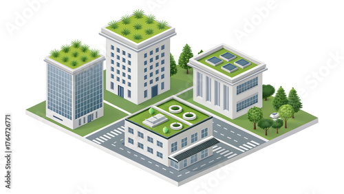 3D Isometric Icon – Eco City Buildings with Green Roofs isolated on White