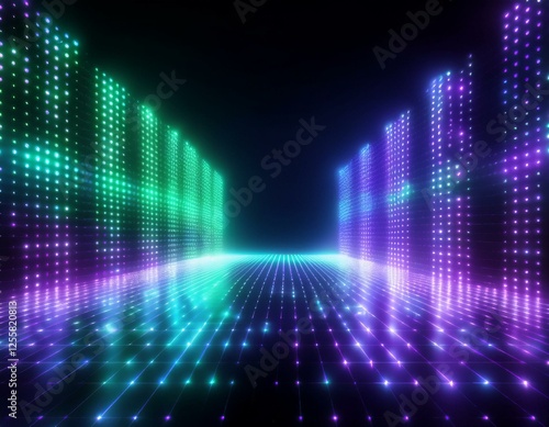 3d render, abstract background, screen pixels, glowing dots, neon lights, virtual reality, ultraviolet spectrum, pink blue vibrant colors, catwalk fashion podium, laser show, stage, isolated on black