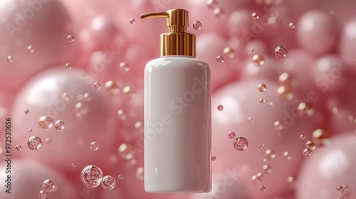 3d render cosmetic bottle with pump dispenser golden cap isolate3d on white background bubbles float balls levitate minimal blank package mockup skin care product sanitizer or cream soap