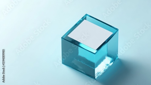 3D render of a blue glass cube with a white blank business card inside