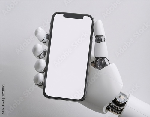 3D render of a white robotic hand holding a smartphone with a blank screen