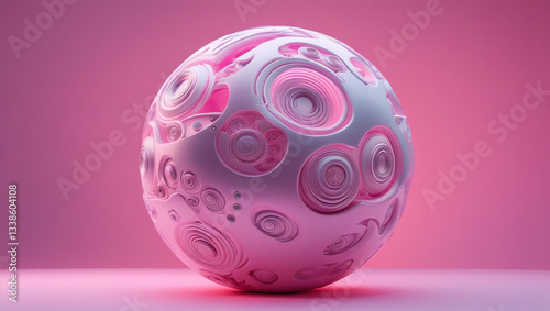 3d render of abstract art glass ball with blur effect on the edges, with organic curved smooth object inside in white matte plastic and glossy painted metal in orange and pink color on light pink back