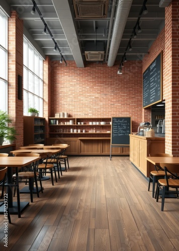 3d render of cafe bar restaurant nobody indoor empty coffee shop interior daytime with wooden design counter red brick wall in background menu writing on blackboard with beautiful letters and cup E
