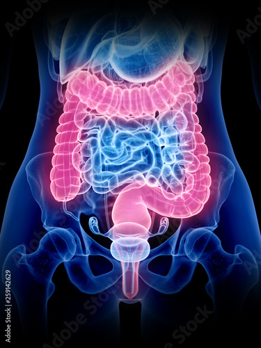 three-dimensional, rendering, illustration, artwork, science, medicals, human, anatomy, body, anatomical, health, organ, inside, internal, transparent, female, woman, bowel, digestive, digestion, intestinal, guts, bowel, large, colon, rectum, transversal, descending, tract, ascending, irritable, pain, inflammation, inflamed, infection, disease, disease