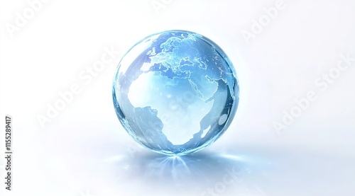 3D rendering of a transparent blue glass globe with a light effect on a white background