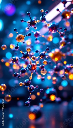 molecular, atom, science, organic, chemical, structure, bond, carbon, oxygen, hydrogen, nitrogen, three-dimensional, rendering, bright, colours, coded, glowing, dynamic, rotate, futuristic, laboratory, setting, scientific, research, biology, chemistry, model, illustration, molecular, analysis, connection, visualisation, complex, digital, graphic, design, technology, abstract, pattern, background, composition
