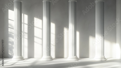 3D rendering of Greek columns on a white background, with soft shadows and diffused light rays