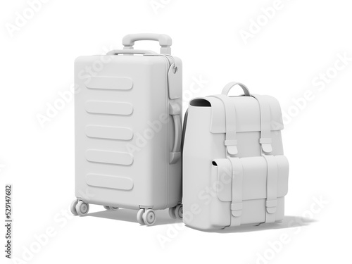 3d rendering. White suitcase and tourist backpack on white background.