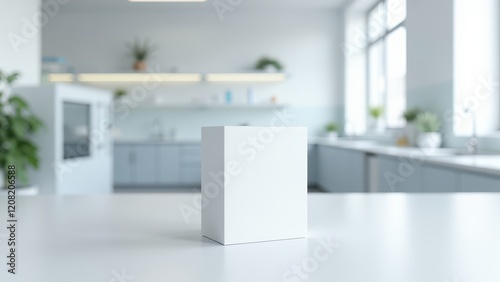 3D Retail Box Mockup, Laboratory with scientific box on countertop photorealistic no blur.