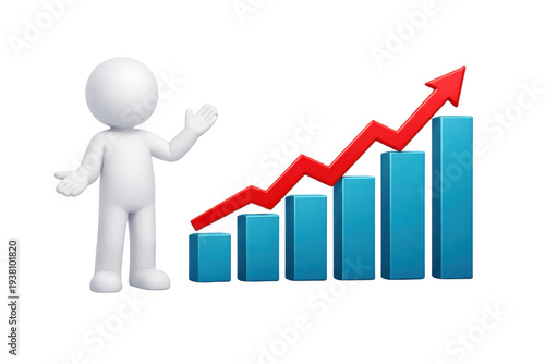 3D white character presenting blue bar chart with red upward arrow, business growth concept, isolated on white