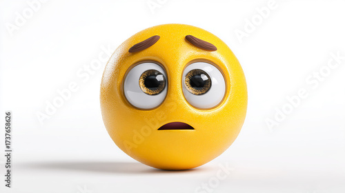 3D yellow emoticon with large expressive eyes and slightly open mouth, showing worry and concern, high detail, realistic lighting, clean white background