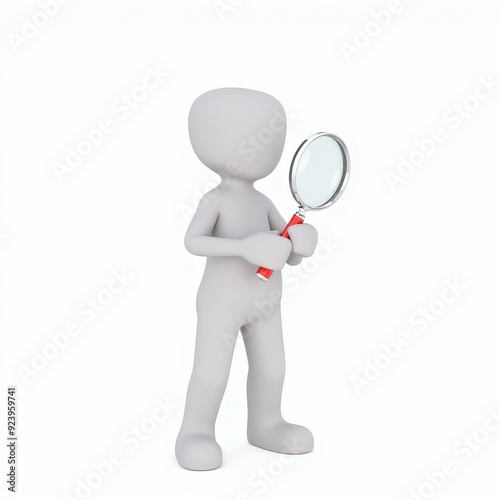 3D-illustration of a simple humanoid figure holding a magnifying glass in a white background.