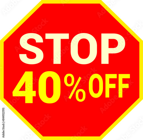 40 percent off.discount for sale.stop sign with red background letters and numbers in yellow.
