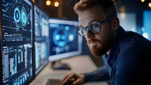 specialist, analysing, website, performance, datum, computer, business, woman, office, working, people, businessman, laptop, monitor, work, cyberspace, person, smiling, goggles, desk, sitting, screen, technology, student, desktop, photogenic, online, boy, keyboard