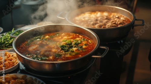 42.A lively scene of a Chinese-style hot pot with two compartments filled with spicy and savory broths, with steam rising and plates of raw meat, vegetables, and seafood ready to be cooked.