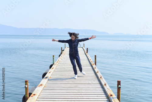 45 y.o. Russian woman running on a wooden pier by the Japanese sea