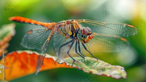 46. A close-up of a dragonfly perched on a leaf, capturing the intricate details and delicate beauty of nature.