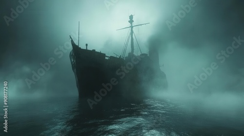 4K Realistic Animation A ghost ship sailing through foggy waters under a dark sky