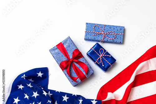 4th of July American Happy Independence Day card with gift boxes in national colors american flag on white background, Flat lay, top view, copy space, banner