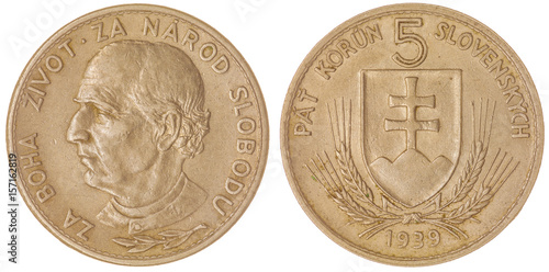 5 korun 1939 coin isolated on white background, Slovakia