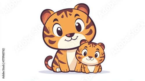 50.A playful kawaii-style illustration of a tiger and her baby, designed for a kids’ coloring page. The mother tiger is gently holding her baby close, with both characters sporting joyful