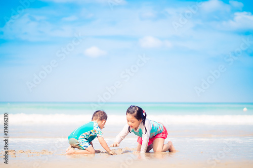 5.10 years old Little asian girl playing on the beach with her 2.9 year old baby brother.Family with children at the beach. EF, Motor skills development.Sibling on Vacation summer and relax concept.