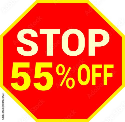 55 percent off.discount for sale.stop sign with red background letters and numbers in yellow.