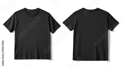 6.Two plain black t-shirts isolated on a clean white background, one displayed in full view from the front, showing a blank template for mockup purposes, ready for custom design or print