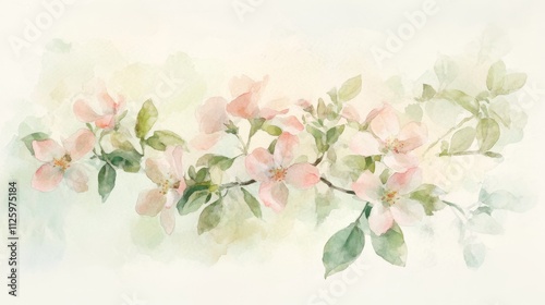 watercolor, illustration, small, blooming, shrub, pale, pink, flower, light, green, leaf, soft, flowing, arrangement, style, blend, gently, 1, colours, next, capturing, delicate, appearance, spring, meadow, plant, ideal, landscape, or, environmental, design