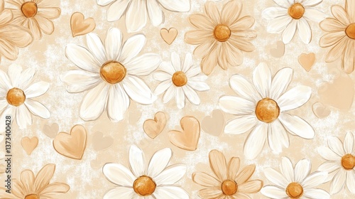 89.A gentle floral pattern with daisies and heart motifs drawn in a minimalist style, using soft neutral tones and a textured background for a cozy, timeless feel.