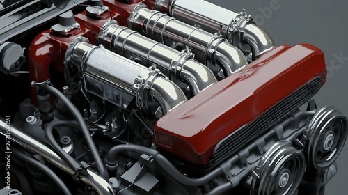 9. **Detailed 3D depiction of a V8 engine with exposed cylinder heads and exhaust manifolds