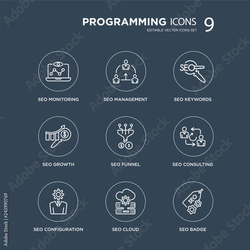 programming, icon, set, vector, line, linear, outline, marketing, development, badge, media, cloud, stroke, thin, black, optimization, computing, business, technology, search, engine, content, network, cyberspace, consulting, process, website, service, adviser, funnel, conversion, social, lead, sale, growth, traffic, graph, chart, keyword, keyword, research