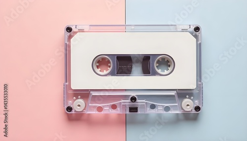 90s cassette tape with blank custom label and plastic cover, placed on soft pastel background