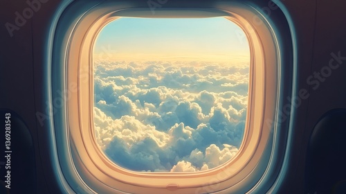 95.A serene perspective through the open window of an airplane cabin, showing the vast, clear sky and soft, white clouds, evoking a sense of freedom and peacefulness.
