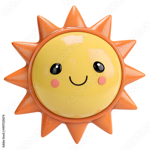 A 3D illustration features a cute, smiling sun with a bright yellow face and rosy cheeks, surrounded by orange, pointed rays. The sun's eyes are small, black, and glossy, and its mouth is a simple.