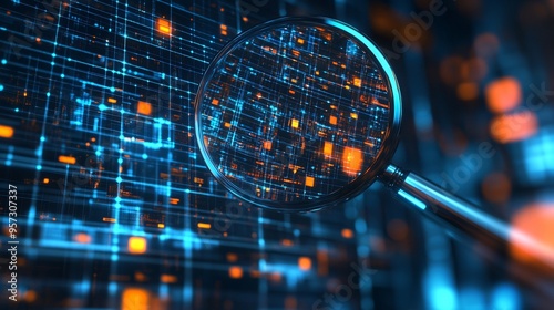 magnifying, glasses, highlighting, key, datum, point, floating, digital, grid