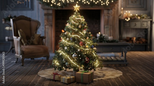 A 3D render of a magical, beautiful Christmas tree. The tree is located in a room with a wooden floor. The room has a rustic décor with a fireplace, a chair, and a table.