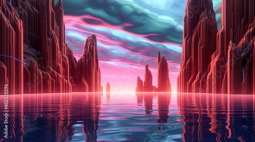three-dimensional, rendered, abstract, wallpaper, sunset, create, design, art, illustration, optical, colours, pattern, glowing, orange, yellow, pink, background, element, scene, generative, ai, sky, night, water, landscape, sun, light, moon, nature, aurora, cloud, fantasy, river, lake, dark, city, blue, northern, star, light, borealis, space, sunrise, cloud, planet
