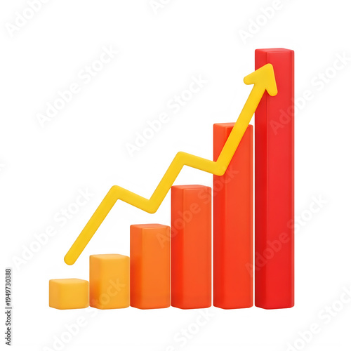 A 3d rendered bar chart showing progressive growth with a prominent yellow arrow pointing upwards isolated on transparent background