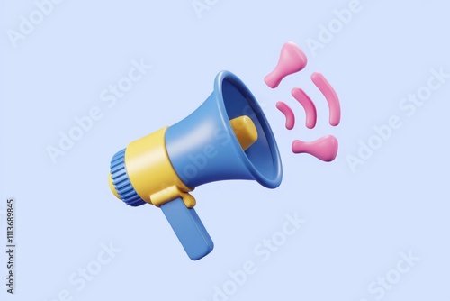 A 3D rendered blue and yellow megaphone with pink sound waves