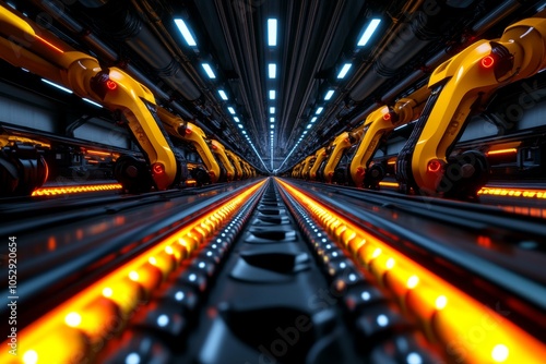scene, fully, automated, factory, floor, robotic, arm, conveyer, belt, vibrant, colours