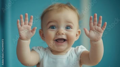A baby is smiling and waving. The baby is wearing a white shirt. The baby's hands are raised in the air