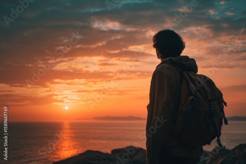 A backpacker gazes at the sunset