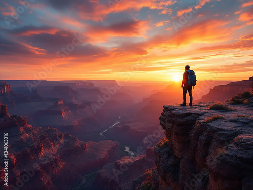A backpacker standing on a cliff edge overlooking a vast canyon with a colorful sunset sky, in a dramatic, adventurous style