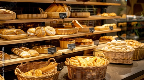 A bakery display with bamboo bread baskets, bamboo tongs, and a variety of freshly baked goods