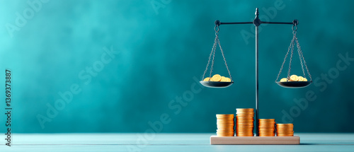 A balance scale with coins symbolizes financial equity and decision-making against a teal background.