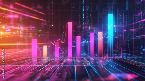 A bar graph with neon-colored bars, showing the progression of business growth, on a high-tech background.