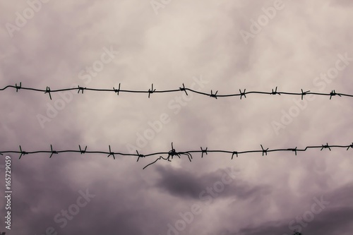 A barbed wire against the gray sky on a gloomy summer day. A barbed wire on the fence of the fenced territory. Like the sky, open to not many and open only to those who are ready to conquer it.