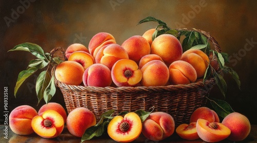 A basket of ripe peaches with a vibrant orange hue, some sliced and some whole.