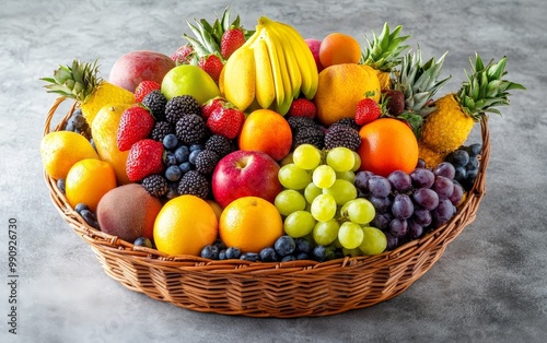 A basket overflowing with mixed fruits, showcasing a vibrant range of colors and textures